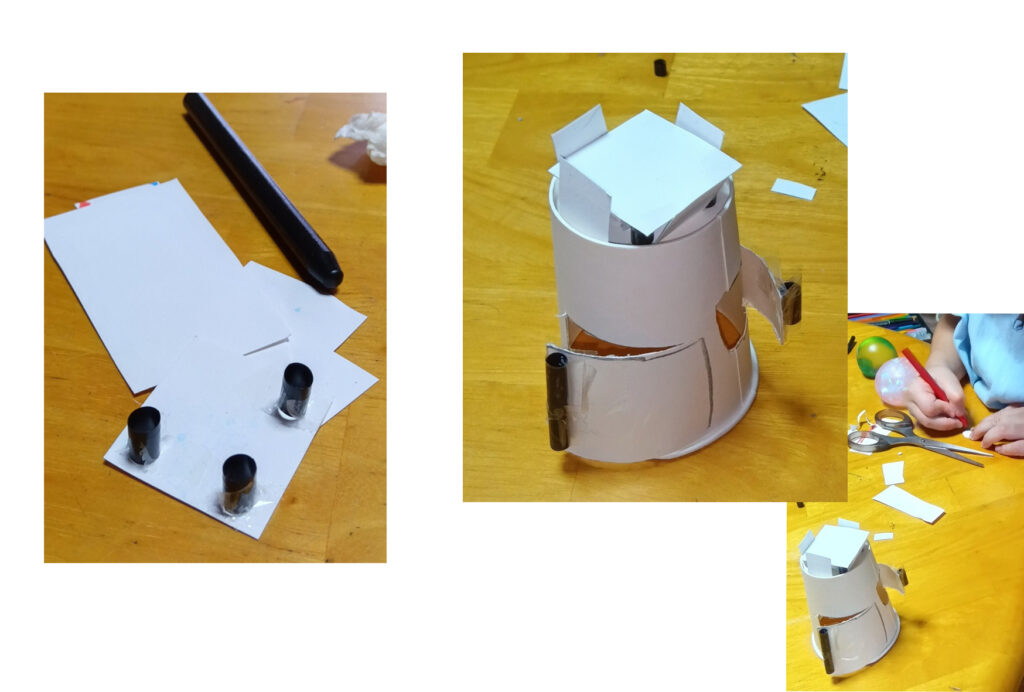 紙コップ、もうひとつ切って?ここは、切らないで残してね、と言ってます。それは、ドアと、窓になりました。ストローを短く切って、ドアの持ち手、窓の取っ手になりました。屋上には、テーブルと椅子が出来ました。