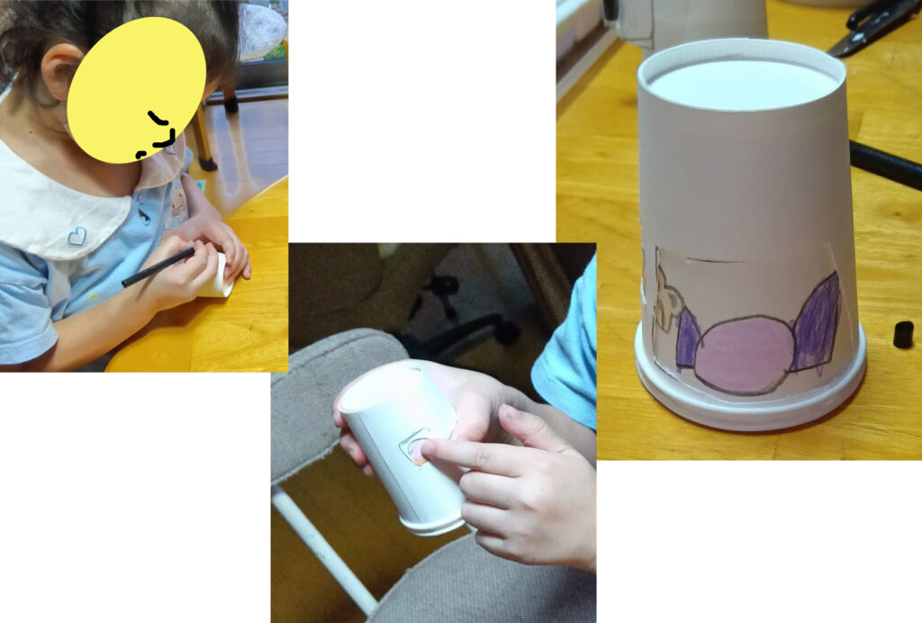 紙コップに線で四角を描いて、ここ、切って?私は、カッターで切り抜いて渡します。その窓に、重ねたコップに描いた絵が見えるのでした。絵は、クッキーとか、キャンディーとか。立体の絵本みたいだね。