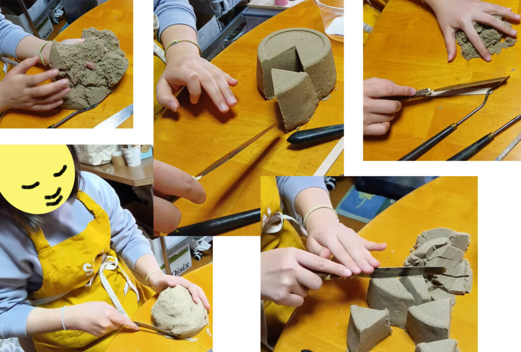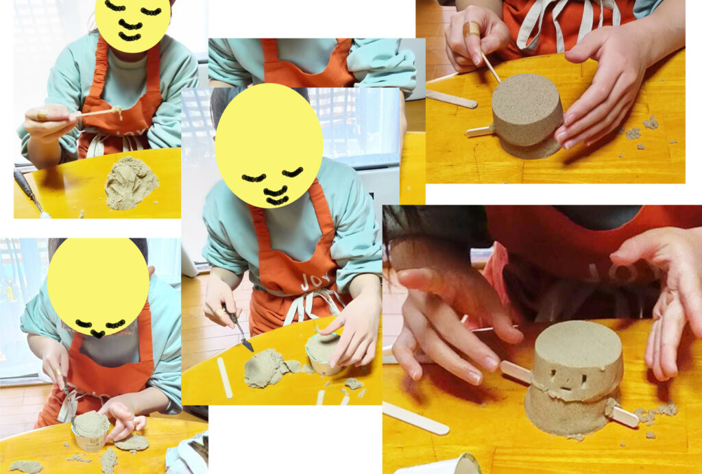 キネティックサンドの手触りは、ふわっとして、でも固めるとしっかり固まるので、楽しいのです。触っていると、その感触や、ナイフで切るサクッという音を遊んでます。砂は、いいですね。誰でも、自然に表情が柔らかくなっていきます。砂遊びで始まったので、今日は、ぬり絵は無しでいくことにしました。2人の手は、サクサク動いていきます。ぬり絵の代わりに、今の自分を味わって始まっているのでした。ぬり絵より、砂の方がわかりやすいかも?と思いました。2人の表情も、手の動きも、砂を触りながら、どんどん豊かになっていきました。自分で自分を感じて、私の方でもそのあたりを感じていければ、十分なのでした。