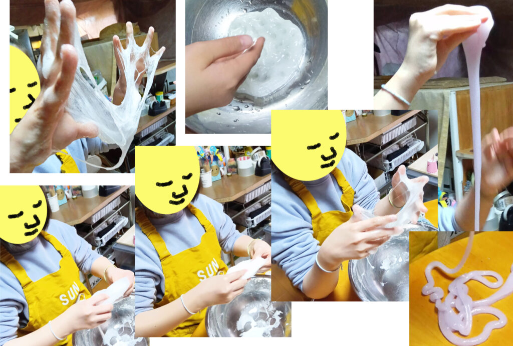 少ししてまた、まだベタベタするけど、手で混ぜていくことにしました。ベタベタのスライムを手に取って、そこに、私がホウ砂水を足していきます。ベタベタするものを混ぜていくのは大変なんですが、ベタベタ具合を味わって遊ぶ2人なのでした。後で写真を見たら、いろいろ豊かな表情してます。「これ、このままだったら、どうしよう?」と話してます。そのまま帰るとか?うーん、それは・・と言って、また混ぜ始めます。ホウ砂水を足していけば、いつかはまとまるのです。まずは、少し固くてもまとまったスライムにして、その後で水を足して伸ばしていくのはどう?と提案しました。練っていけば、柔らかくてキメの細かなスライムになるよ?と言って、応援します。