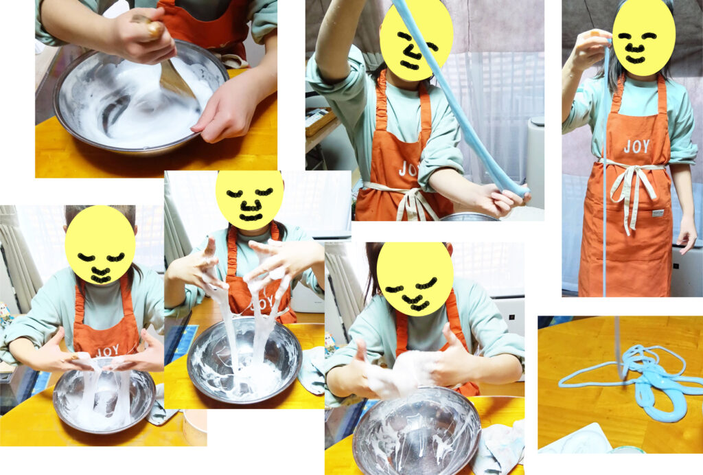 混ぜて、混ぜつづけて、しばらくして、2人とも、手が止まって、グロッキーになりました。「スライム作りに疲れた少女たち」って写真が撮れそうでした。気を取り直して、また混ぜつづけます。ホウ砂水を足して、「そろそろ来るかな??」と、言ってます。全体がまとまり出して、ボールの内側から、はがれてくるのを待っているのでした。