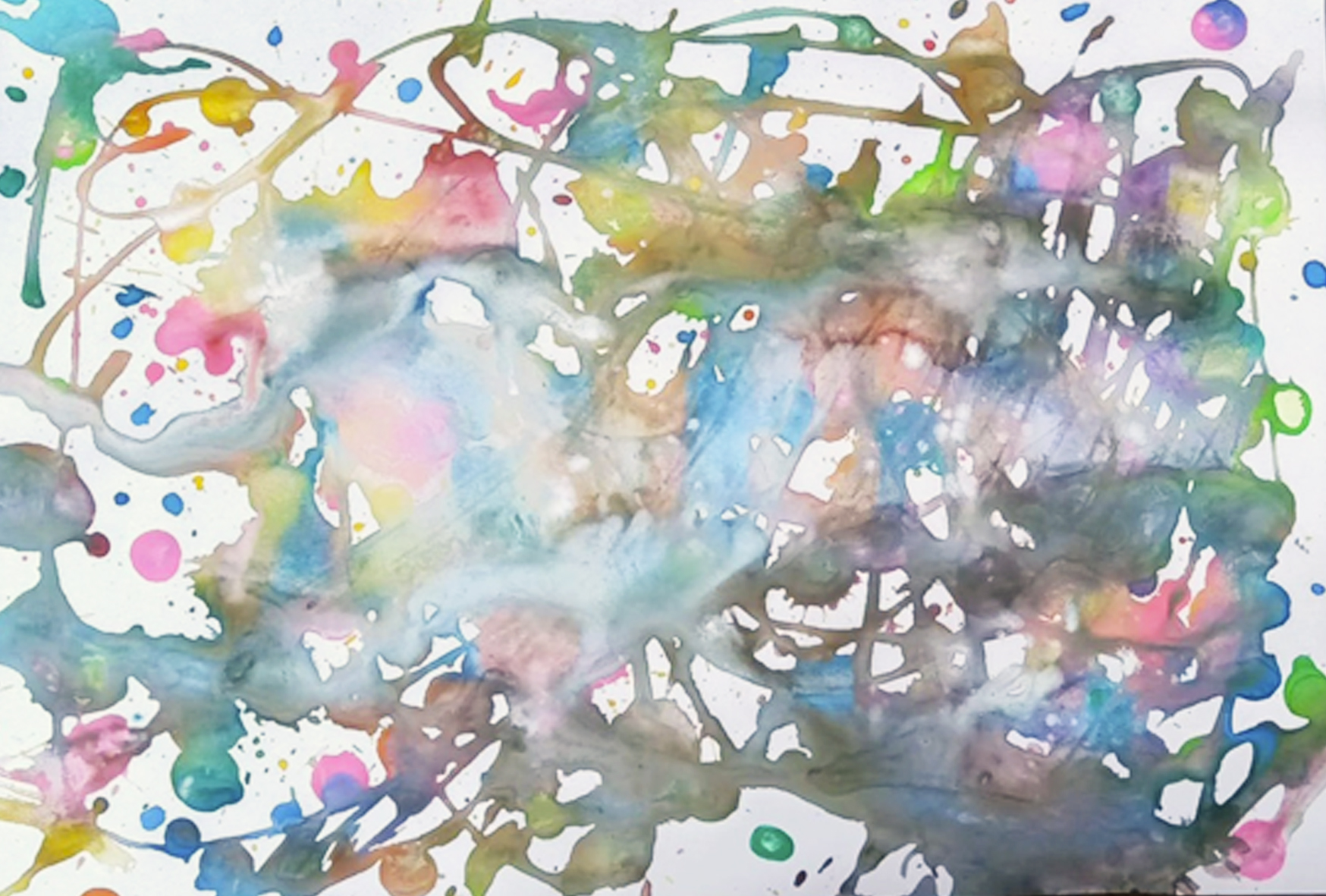 今日は、スライムをやりたい、とSちゃんの希望です。OKです。じゃあ、その前に、スポイトの絵を描こうか?うん、いいよ、ということで、スポイトの水彩画、3人で1枚の絵を描くことになしました。「みんなで1枚の絵」の役割は、相手と自分を味わうこと、でしょうか。この絵の面白いところは、思い通りにいかないのを、味わっていくことなのです。それでも、毎回、味わい深い画面が出来ていきます。全部思い通りにならなくても、面白いじゃない?を実感できるので、まずはこれで、ウォーミングアップするのが、おすすめなのです。なんというか、誰よりも上手く、センス良く、早く、という方向に向かいがちな気持ちを、さりげなくシャッフルしてくれる気がします。