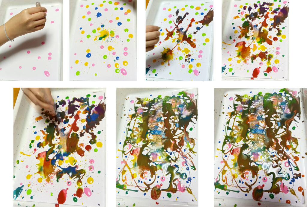 スポイトの絵を乾かしながら、時々様子を見てました。少しして、上手いことまとまってきたので、絵の具で色を付けています。ここまでくると、安心して遊べます。このころ、ちょうどお母さんがお迎えに来ました。よーく伸びるので、椅子の上に立って、高いところからスライムを伸ばしてます。スライム、間に合ってよかったです💗