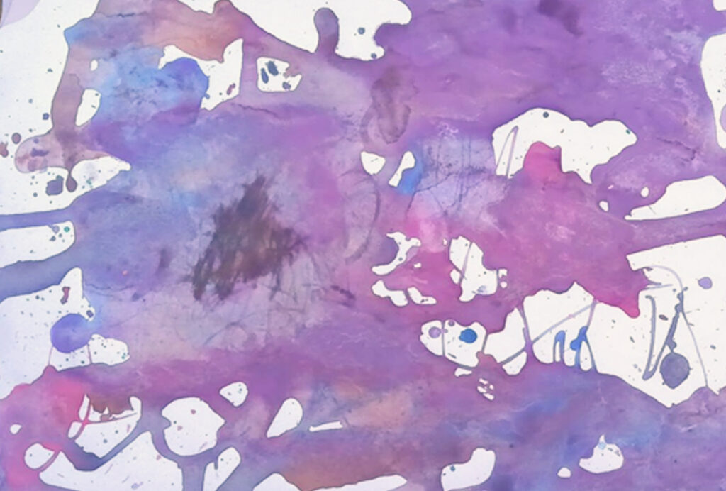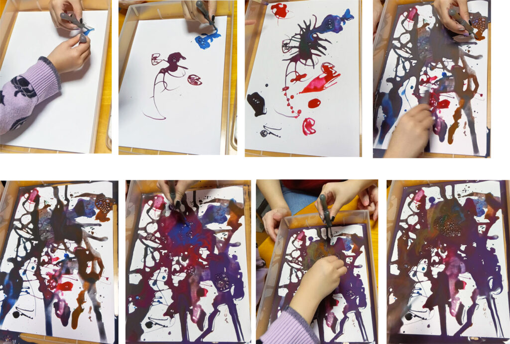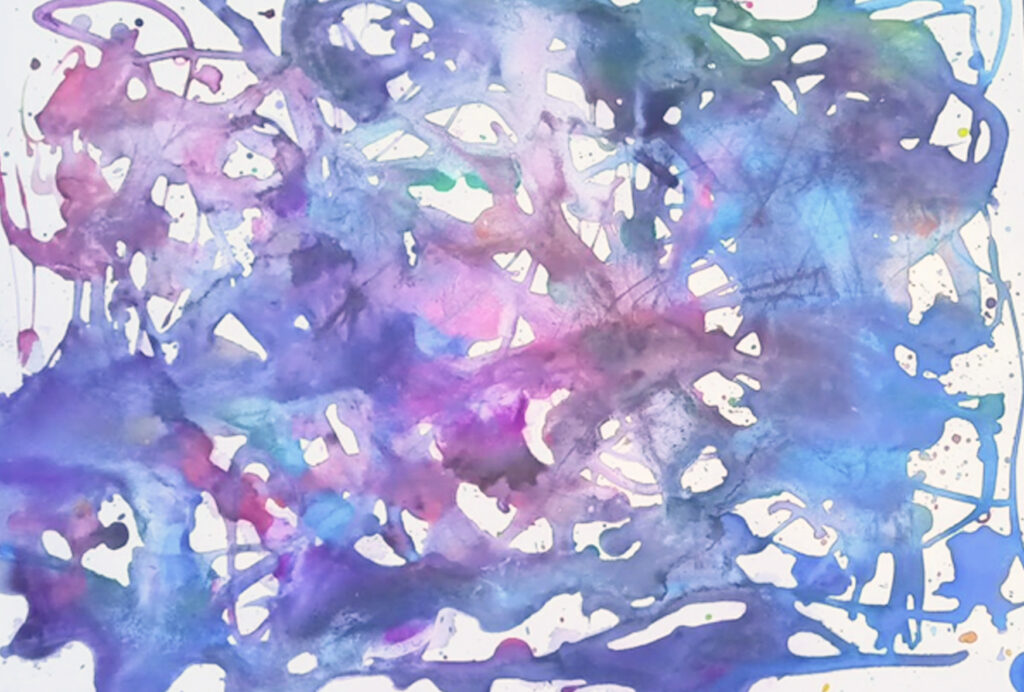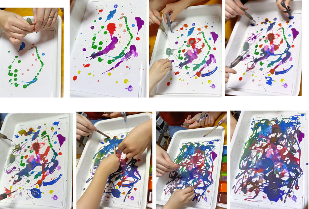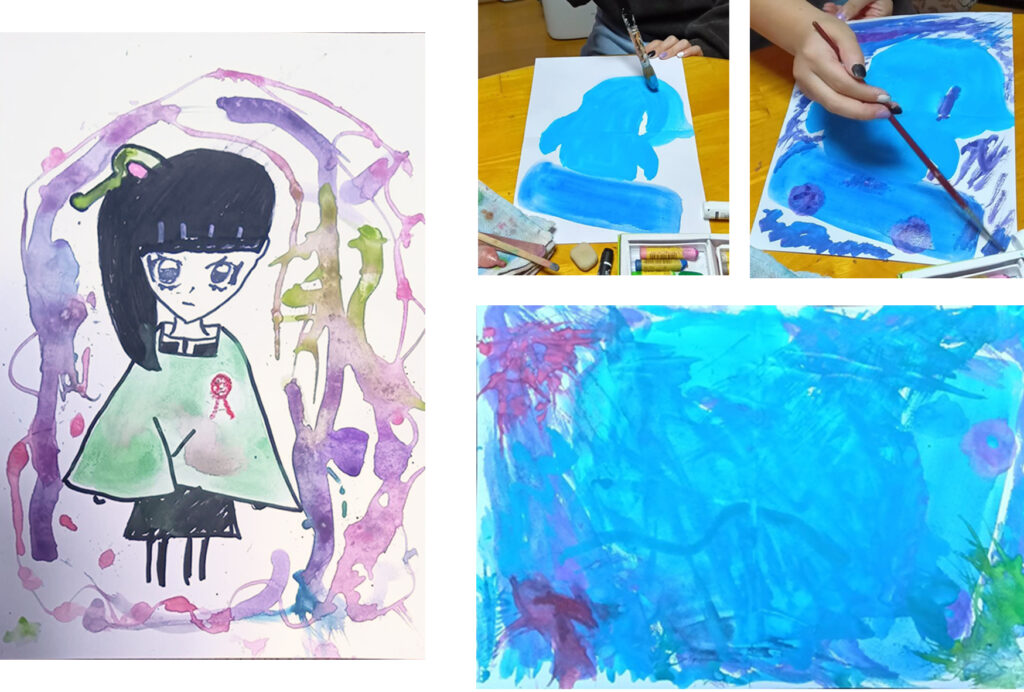 Mちゃんは、女の子を描いて、その周りを、さっきのスポイトの絵のように、いろんな色を置いていきました。そのあとのもう1枚は、青い絵の具をたっぷり気持ちよく使って描いてます。
