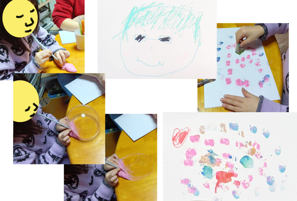 その後は、3人それぞれの絵を描きました。Kちゃんは、サクサクと3枚描いて、その後は、スライムで遊びました。少しこねてから、ストローで風船のようにふくらませて遊びました。何回か、スライムをまとめて形を作ってあげると、工夫のやり方がわかってきて、風船ができるようになりました。楽しいことを集中して遊んでいるので、静かな時間でした。空気がモレないようにするのが、コツなのです。