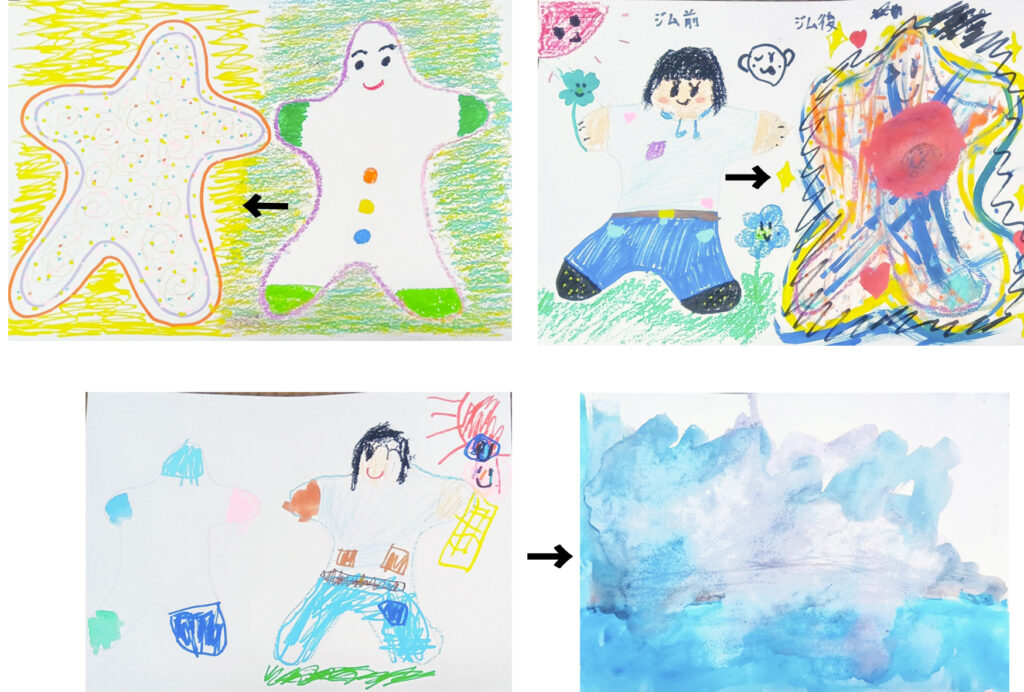 Mちゃんのぬり絵は変化が大きいのでした。ジムに行った後みたいに気持ちがいい感じ、と言ってました。たしかに、たくさん運動した後みたいな体の絵になってました。Mちゃん、嬉しそうな笑顔でした。