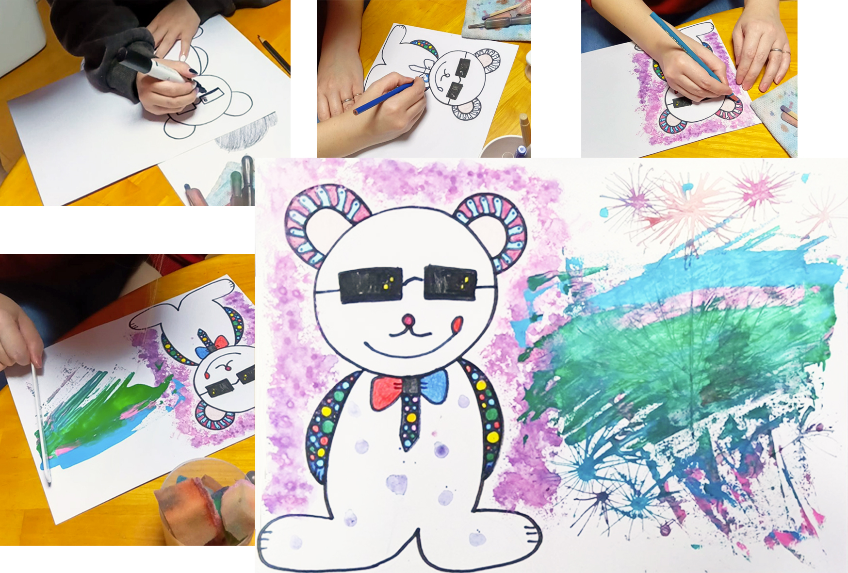 写真-7 お母さんの絵です。好きな絵の遊び方と、新しい遊び方をトライしてます。