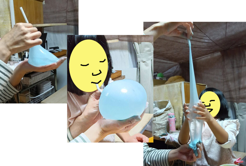 お母さんもスライムを少し持って、こねています。上手に水と合わせてこねていくと、よく伸びるスライムになりました。すると、ストローでふくらませて風船が出来るのでした。