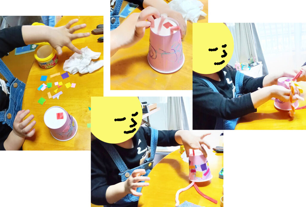 紙コップとモール、どうなるかな?別々のものになるかな?と思ったら、紙コップの底を、トントンしています。ここに穴を開けるの?と聞くと、うん!とうなずきます。その穴に、モールは通されて、もう本もうひとつ別の穴を開けて通されて、モールは長い足になったみたい。ぴょんぴょんさせて遊んでます。アートっぽい何か💗が出来ました。