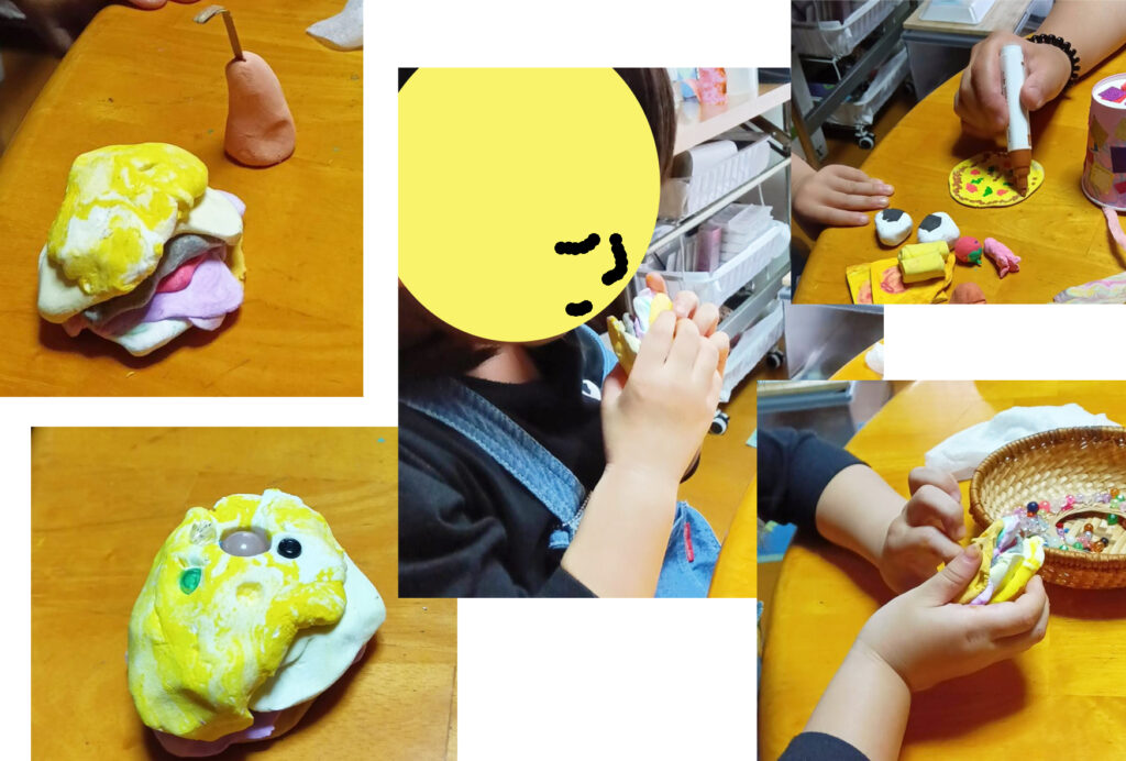 紙粘土も、遊びました。前回作ったハンバーガーは、お父さんにも好評だったようです。そして今日もハンバーガーを作るようです。チューブの絵の具をしぼるのも、すこしずつ出来るようになってきました。そして、混ぜるのは、お母さんにお願いするのでした。途中で、「あれ!」と指さしたのは、別のお友達が作って置いていった、ピザとお弁当の紙粘土でした。そのお弁当をぱくぱく食べて💗また詰め直してを繰り返しました。最後に、お母さんと、ポスカでピザを作りました。柔らかい紙粘土に、ポスカでちょんちょんと色を付けるのでした。お父さんにお土産ができたね、と言ったから、それで、帰り支度もスムーズだったかな?今日は、アトリエで出来ることを、次々に💗遊んだ日でした。
