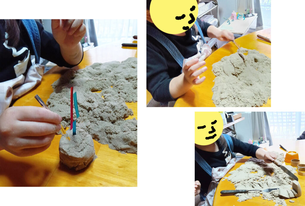次は、何したい?と聞くと、キネティックサンドを指さします。今日は、展開が早い💗砂を広げて、サクサク遊びます。フィルムケースに詰めた砂、そのままの形で出してあげたら、目がキラキラしてました。そんなにうれしいなら、もっと作っちゃおうか?!とつい、孫を見てるおばあちゃんモード💗になりそうでした。