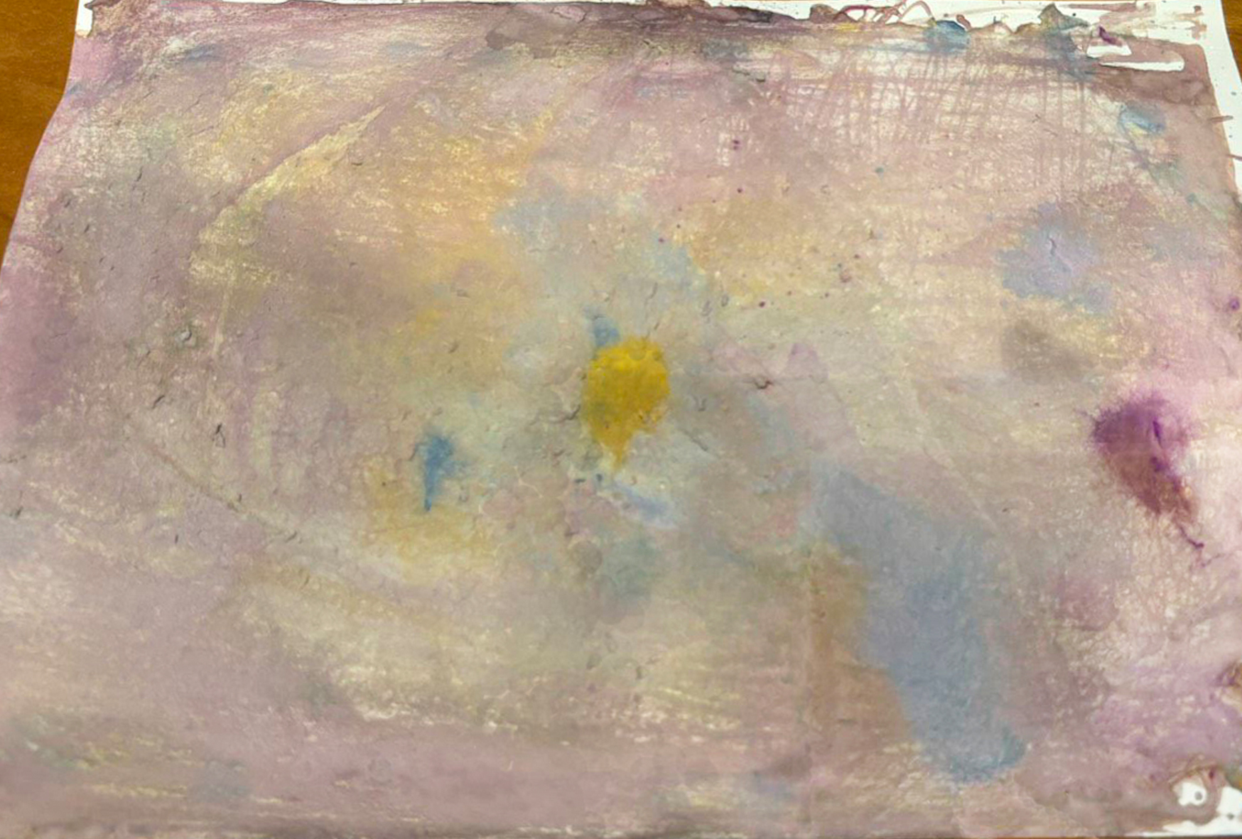 写真-1 1時間近く、絵の具をたらしたり、アイスの棒で引っ掻いたり、絵の具を寄せたりして遊んだ跡です。