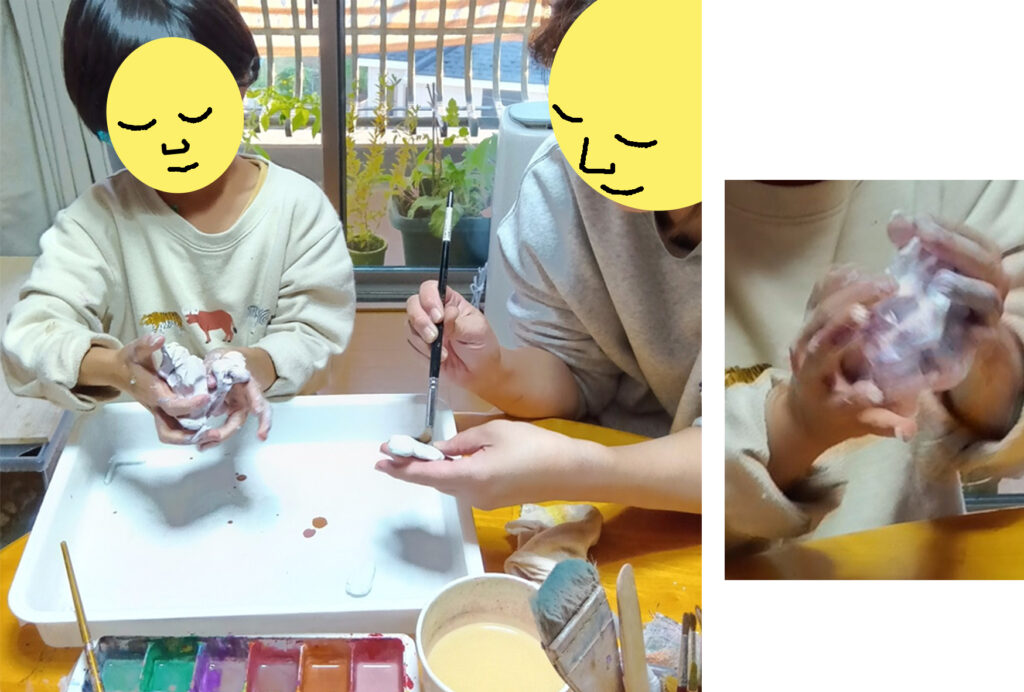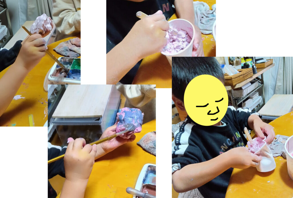 その後は、紙粘土で遊びました。2人とも、何かを作るより、絵の具を混ぜて、色と感触を味わっているようでした。