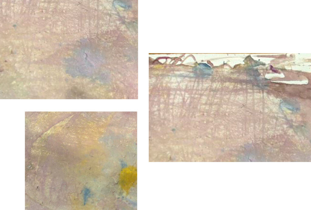 今回は、私のスマホの容量がいっぱいだったせいで、この絵を遊んでいる写真が、保存出来てませんでした。すみませんm(__)m。乾燥して持ち帰った絵の写メをお母さんに送っていただきました。時々、写真を撮り忘れたときは、こんなふうにお願いしています。ありがとうございます💗丹念に遊んだ跡が、残っているのがうれしいのです。よく見ていると、引っ掻いた跡や、絵の具の染みが爽やかなのでした。なので、部分を大きくして並べてみました。