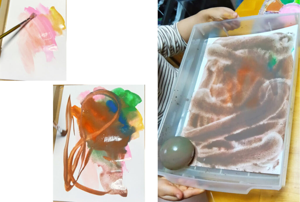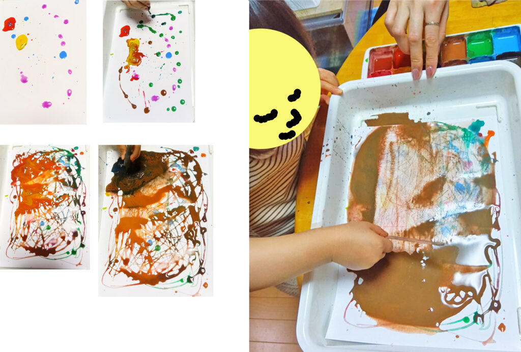 2枚目も、ぐんぐん描いていきます。スポイトは使わないで、筆で描いて行きました。ボールを転がして絵を描きました。ダイナミックな跡が残ります💗