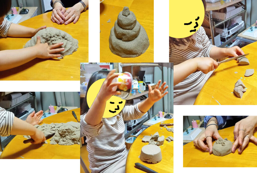 キネティックサンドは、手触りが気持ちいいのです。お母さんもケーキを作って遊びます。Aちゃんもケーキを作って、お母さんと私に、渡してくれます。何度も渡してくれるので、そのたび、いただきます💗と3人で言って食べる遊びになりました。10回くらい言ったような気がします。おままごとに私も参加できて、楽しかったです。