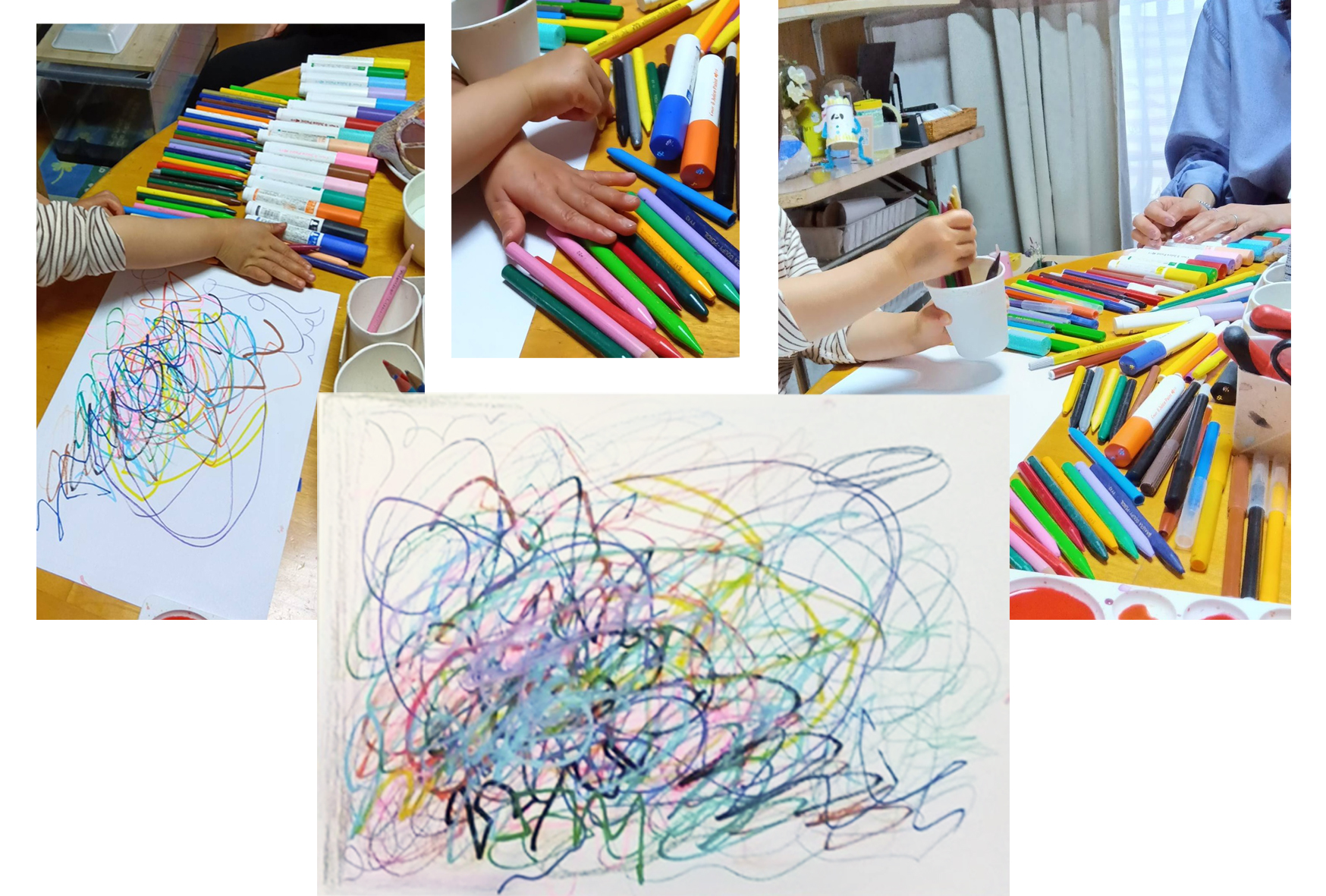 3枚目、何がしたい?と聞くと、ポスカを指さします。ポスカが気になっていたようです。Aちゃん、箱からポスカを手にとっては、次々に並べていくのでした。きれいに並べてから、1本づつ描いてはフタを閉めて、戻すのでした。全部戻し終わって、もう一度、今度はクーピーも並べて、さらにポスカも並べて、テーブルがいっぱいになります。描きながら、Aちゃんの興味がOFFになったので、私とお母さんで、片付けました。OFFになっちゃあ、しようがない💗