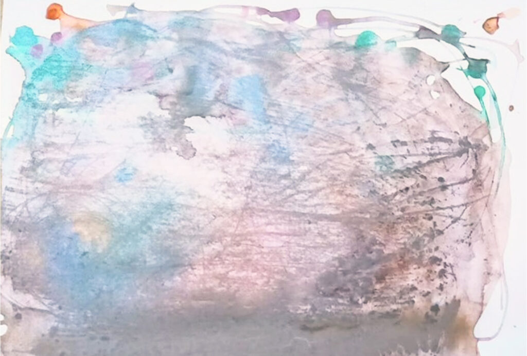おしゃべりをしながら、絵も進んでいきます。色のことも、形が面白いことも、話してます。Aちゃん、途中で、パレットに色作りを始めました。画用紙に戻ってくれるかなあ?と待っていると、しばらくして、パレットの色を全部、画用紙に流し入れたいAちゃんなのでした。OKです。おお、絵の具が増えたので、こんなのもあるよ?とアイスの棒を渡します。アイスの棒で、絵の具がぐーっと押されていくと、画用紙に染み込んだ絵の具が見えて、意外な新鮮さがあるのです。気の済むまで遊んで、完成しました。端に、お母さんの置いたきれいな色が残って、いい感じです。