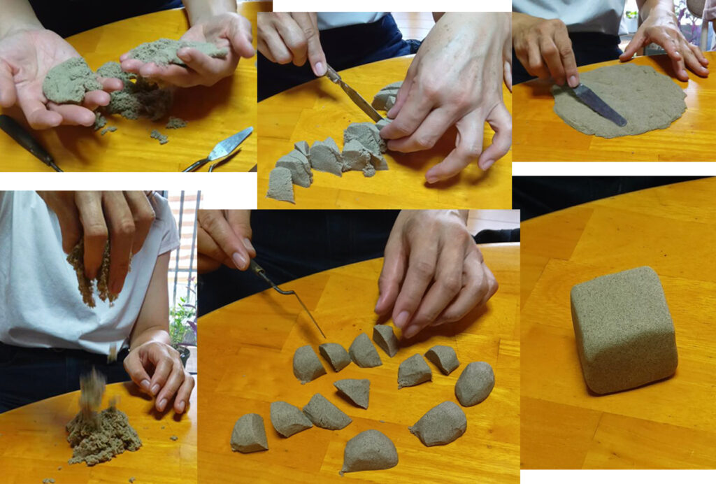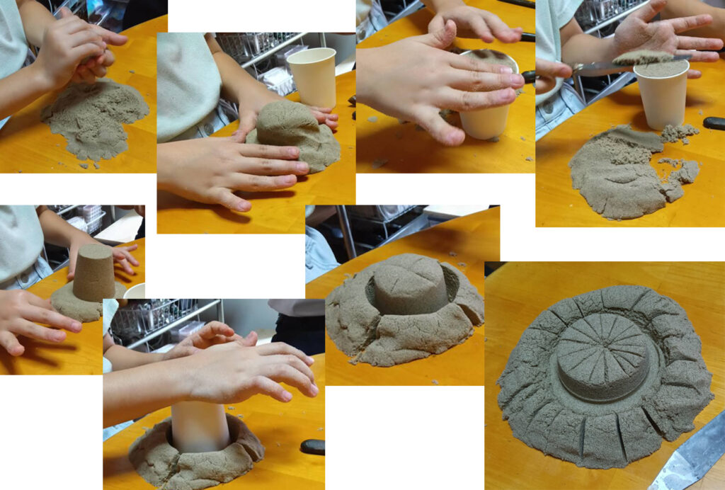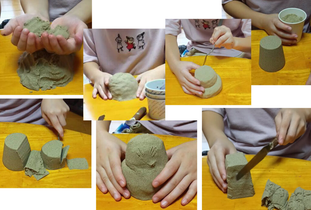 それから、砂で遊びます。キネティックサンドは、手触りが面白い。ホロホロする砂、よーく味わってます。私の子どもの頃は、土とか泥とかさわって、こころの平安とつながってたと思うんです。今の子ども達が、スマホを見たり、ゲームをしたりするときにはその感じはしない、と思うんです。