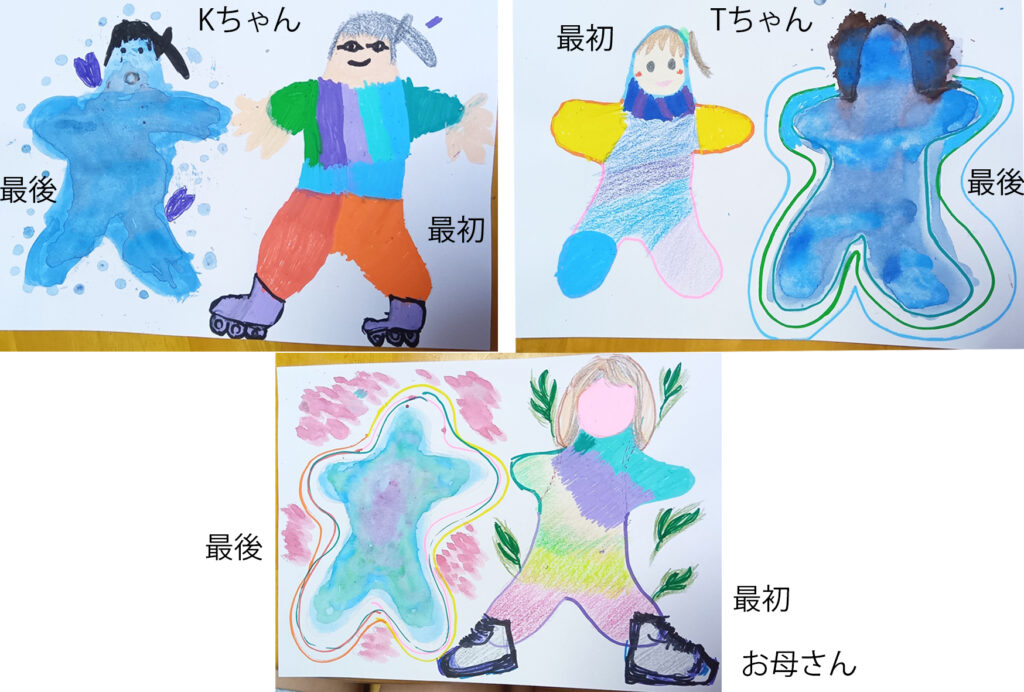 写真-1 ヒト型ぬり絵。最初の自分、楽しそうです。最後の自分は、水彩で描かれてます。自分の境界がゆるんで、外とつながってるのかもしれないなあ。すごく楽で自由な感じ、します💗