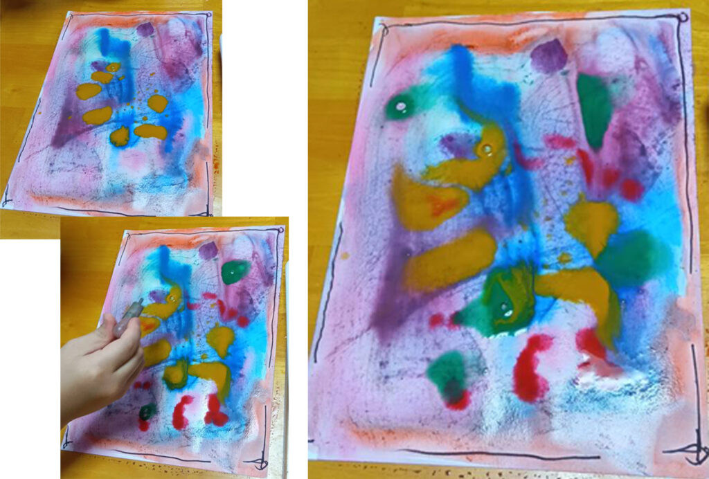 その後で、みんなで1枚の絵を描いて行く遊びをしました。滲んでいく色を味わっていきます。今現れた色が、すぐ背景になって、深さを増していきます。不思議に魅力的な画面になります。そろそろ、完成かな?と画用紙をやぶれないように移動しようとすると、みんな、そーっと手を伸ばして、大事な大事なものだよね、という感じで持ち上げてくれました。