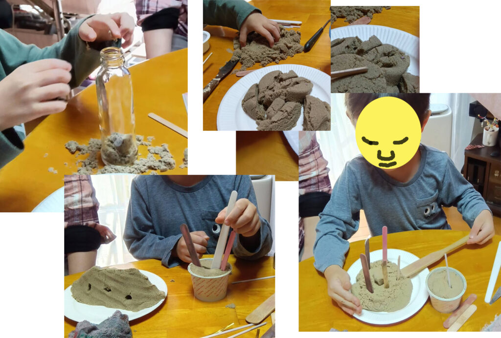 写真-7 キネティックサンドで遊んでます。右下はTHくんが、ケーキを切り分けようとしているところ。本物のケーキは、なかなか触らせてもらえないので、子どもさん達は、砂のケーキを大事に遊びます💗