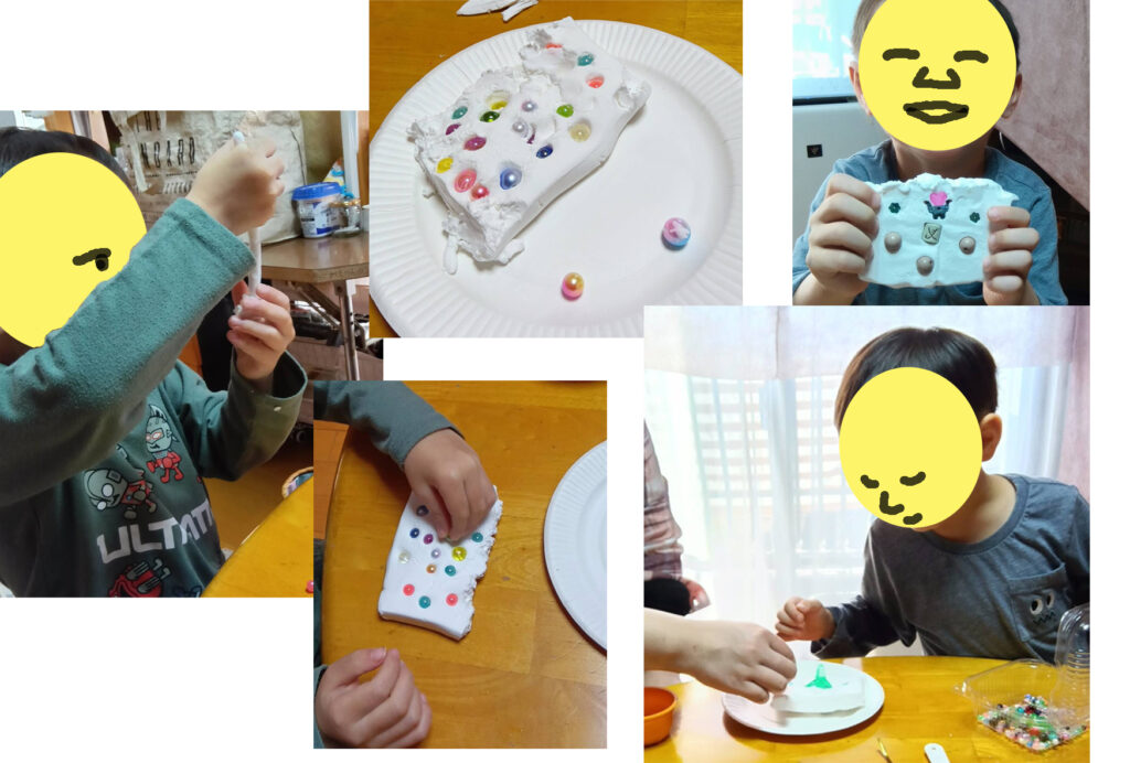 紙粘土も出して渡したら、そのままの形の紙粘土に、ビーズが埋められていきました。ビーズの色が冴えてきれいです💗。THくんは、目や鼻を付けて顔を作ったようでした。大人は「どれが目だっけ?」なんて聞いてしまうけど、本人は、とても満足そうなので💗紙粘土で、いろんな形を作るのは、この次かな?