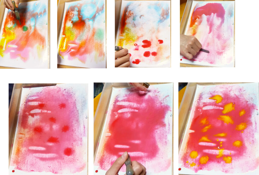 写真-5 2人で描くスポイトの絵、3枚目最初から完成まで。