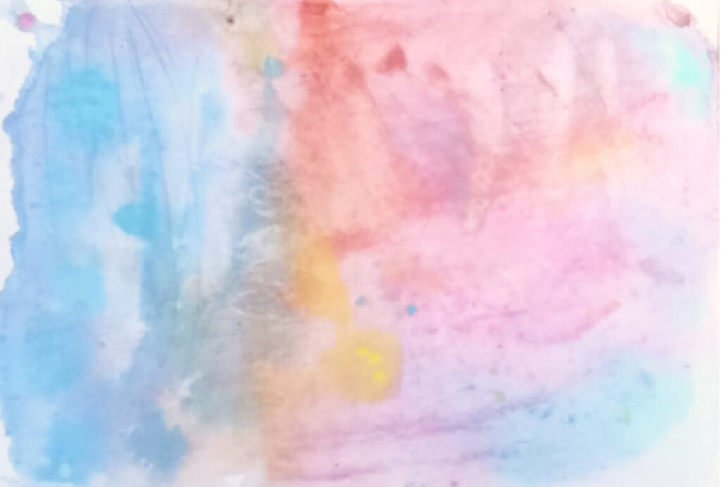 気楽さを味わっていくのは、スポイトで遊ぶ絵が面白いんですよ、と始めていきます。どんなふうに始まっていっても、面白い絵になるんです。お母さんとRちゃん、それぞれに色を置いていきます。色の水玉や模様が増えて、少しづつ混じりあっていきます。でも、全体で混じり合うことはなくて、お母さんの領域、Rちゃんの領域ができていました。Rちゃん、自分の領域を守りたいように見えました。お母さんも、それをわかっているので、Rちゃんの領域を守りながら、自分の表現をしています。いい絵も、悪い絵もないのです。そういう表現が大事だった、ということなのです。