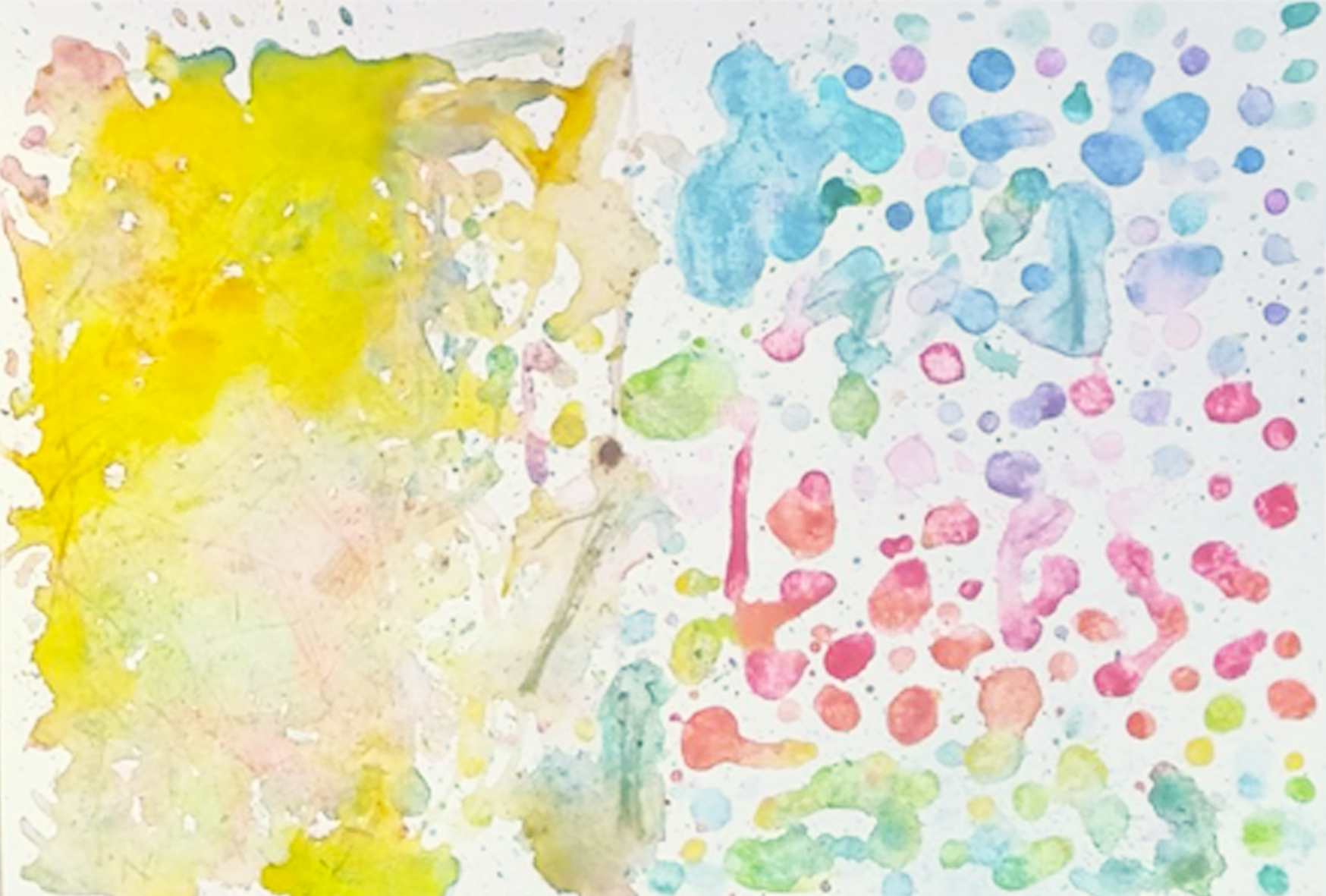 2枚目は、画用紙を水で濡らして、始めます。2人の色は、自然に混じっていくのではないかな?と思ったら、やっぱり領域が大事なのでした。途中から、Rちゃんの領域になっていきながら、鮮やかな赤と黄色が登場してます。アイスの棒も活躍してました。Rちゃんの手は、大きく動いて働いてます。