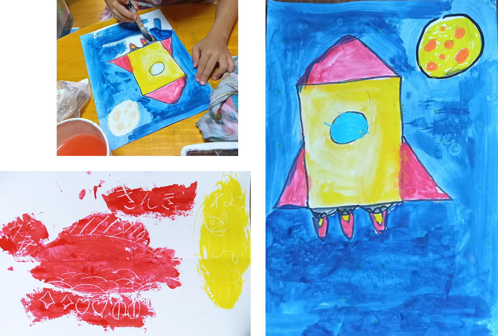 Mちゃん、5回目です。お母さんとふたりで参加です。さっそく1枚、描き始めます。えんぴつで、ていねいに描きながら、歌ってます。ロケットの絵を描いて、弟さんに見せてあげるの、と、お話しながら描いてます。ボスカで黄色をてんてんと描いて、その上を青の絵の具でなぞると、黄色がじわっと小さく広がっています。お母さんが、気づいて、おおー、光ってるみたい。そんなふうになるんだねー!と、私も勉強させてもらいます。