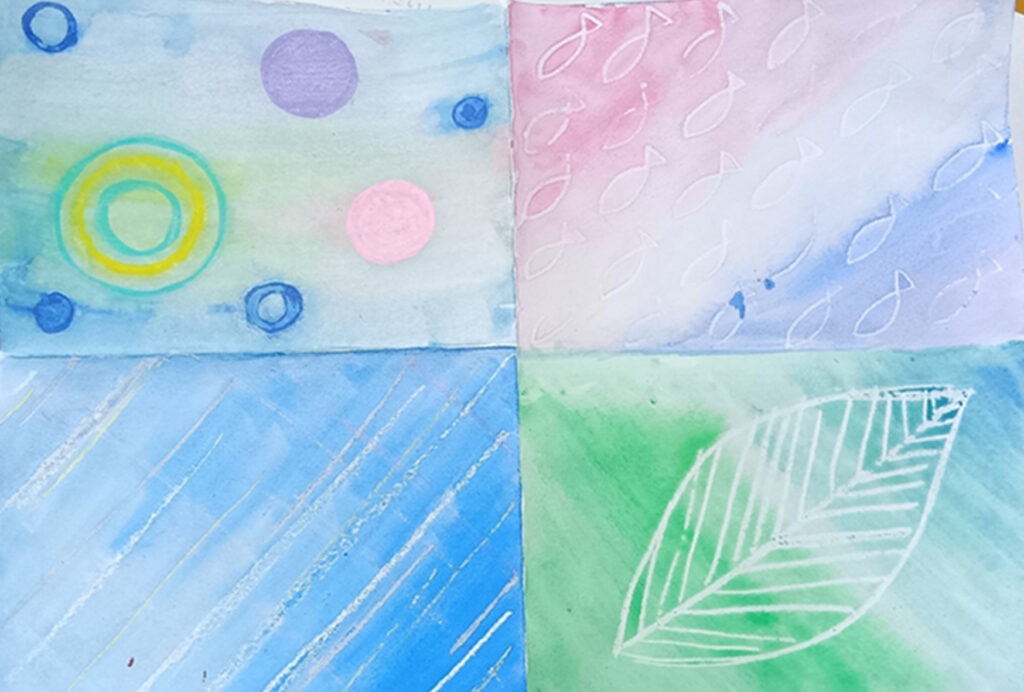 お母さんは、画用紙を4つ折りにして、描き始めてました。もちろんOKです。どうぞ、いろいろ遊んでみてください。「いろんなパターンで描いてみたかった」そうです。折り目を使って、4つの絵を描いてます。Mちゃんのやっていたやり方、白のクーピーで線を描いた上に水彩を塗るのも、ポスカで描いて水彩でにじませるのも、さっそく遊んでました。
