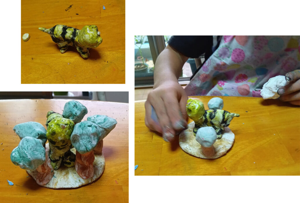 そして、風を知っているMちゃんはおしゃべりするように、紙粘土で形を作っていきます。作るのは、楽しいにきまってるー!という感じです。お弁当持ってきたら、一日中こうやって遊んでるよねと、お母さんが言ってます。はい、そんな感じします!