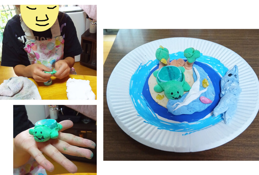 Mちゃん、歌いながら、描いてます。Mちゃんは、紙粘土でカメを作ります。そして、島を作って、波を作って・・・と、どんどん作っていきます。あと残り15分くらいのとき、トラも作り始めました。もっと作ってたいなあ、というのでした。そんな勢いは、絵にも紙粘土にも現れてると思います。