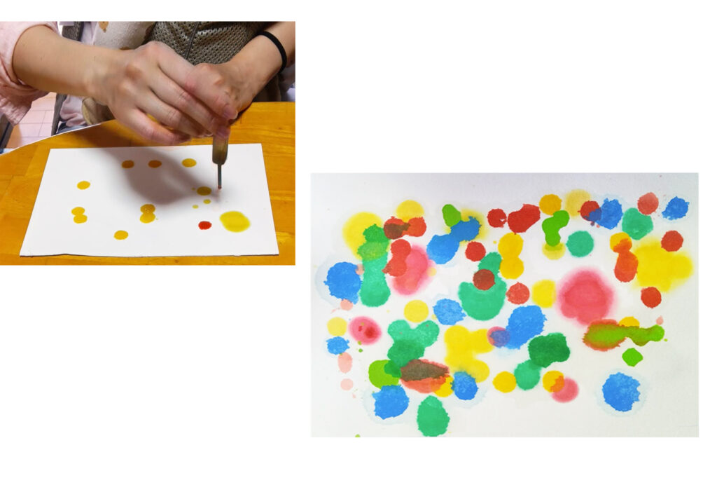 思いついて、お母さんにも水彩絵の具で遊んでもらうことにしました。吸い取り紙に、スポイトで絵の具を垂らしていくのです。好きな色で、好きなように遊んでみてくださいと、言いました。お母さん、スポイトで、黄色をポトンと落としてます。吸い取り紙が、絵の具を吸い込んでいく感じは、独特です。何色か落として、「これ、楽しいです💗」と言うのでした。素敵な絵が、出来ていきます。自然に手が止まるまで、ゆっくり遊んでもらいました。Rちゃんも、それ、やりたいと言ったので、じゃあ後でやろうか?と返事をしたんだけど、今回は時間が足りなくなってしまいました。次の時、やろうね!