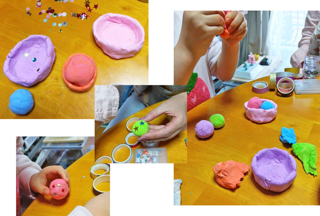 写真-3 紙粘土、絵の具を練りこんで、カラフルです。スパンコールも💗