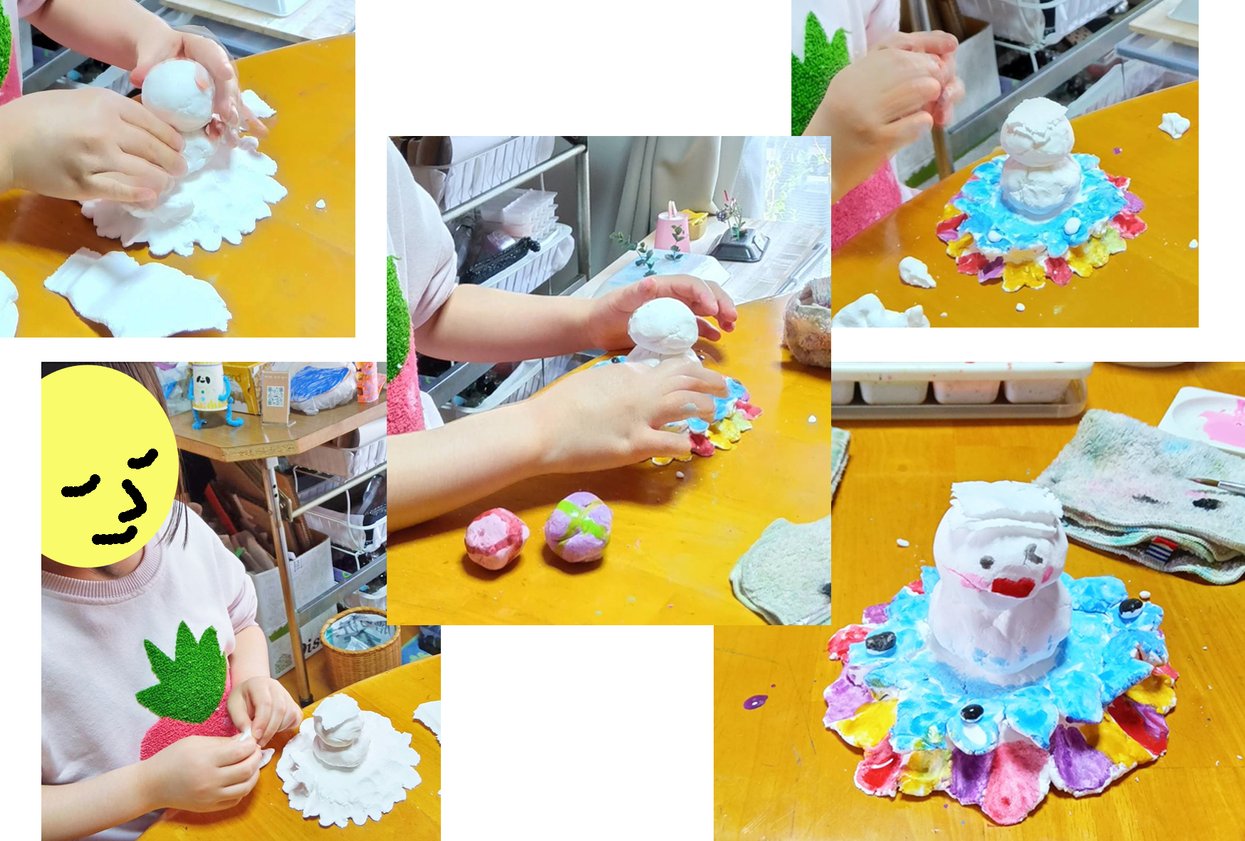 Rちゃんの紙粘土は、雪だるまになっていきました。花びらのようなスカートのような形は、雪だるまを乗せる台になりました。乗せるとき、転がりやすいのが気になって、ここをくっつけたいんだけど、と言ってます。つまようじを短く折って見せて、これで台座と雪だるまをつなぐのは?と提案したら、すぐわかってくれるのでした。サクサクと丹念に絵の具で色を付けて、出来上がりました。なんていうか、道端の雪でサクッと作るみたいに、気軽に作るのでした💗