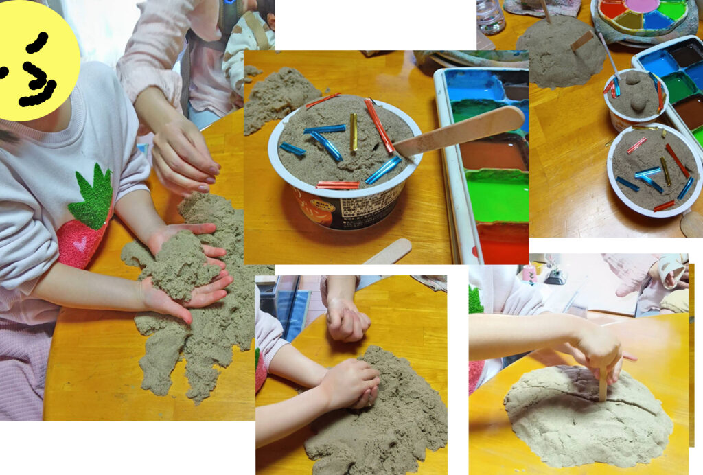 一息ついて、次は、キネティックサンドで遊びます。砂、というと、たいていの子どもさんが、うれしそうにキラキラした目になるのです。大人も、喜びます。キネティックサンドの、ふわふわした感触を、お母さんと一緒に楽しんでます。考えてみれば、テーブルの上で砂を遊ぶ経験は、なかなかないかもしれません。まとめたり、切ったり、カップに詰めて、アイスができました。ワイヤータイを「短く切って?」と頼まれたので、このくらい?と切っていきます。それは、アイスのトッピングになるのでした。