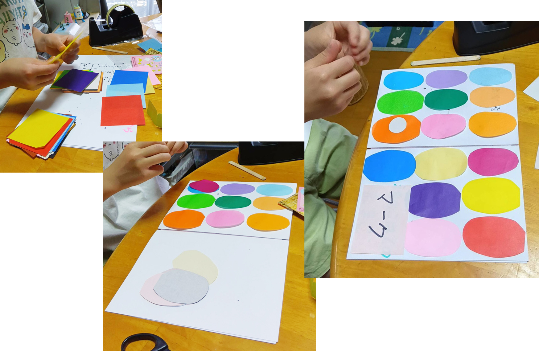 それから、Aちゃんは、「絵本を作りたいんだ」、と言って画用紙を折って、ページを作っています。丁寧に表紙を描いてます。小さい折り紙の中から、好きな色を重ねて、卵型に丁寧に、切り抜いています。それを、ページに並べて貼っていくと、もう素敵な絵本のようなのでした。Aちゃん、「ここに、シールを貼ったらいいのかな、なんの絵本にしたらいいかわかんない」と言ってます。でも、アドバイスを求めてる感じではないのです。