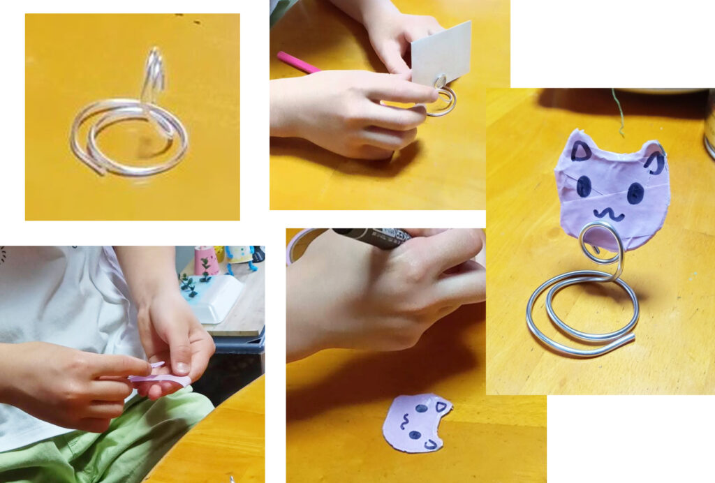 カードを立ててある針金の工作を見て、これ、作って?と言います。こんな感じでどう?と渦巻きにした針金が、ちゃんと立っているのを見ながら、カードを挟むところを作ります。Aちゃんは、挟むモノを作り出してます。細い針金でネコの頭の形をつくって、マスキングテープを巻いていきます。その後、周りの余分なテープを切って整えてます。Aちゃんは、イメージが先に出来ると、サクッと形が出来ていくのです。ひらめいたものが、材料と、色と、形と一緒になって、サクッと出来るのがNちゃんのやりやすい工作なんだなあ。