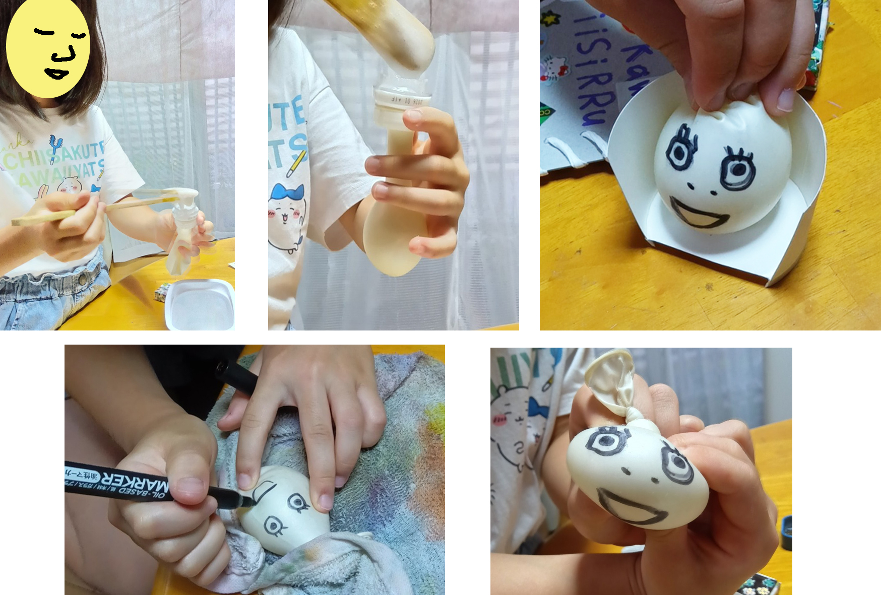 最後に、スライムがあったので、風船に入れて、スライムボールを作ることにしました。トロトロのスライム、ヘラから少しづつ流し入れてます。ゆっくり、風船に入れていくのが楽しそうでした。顔も描きました。いい顔だねー!顔で遊べます💗