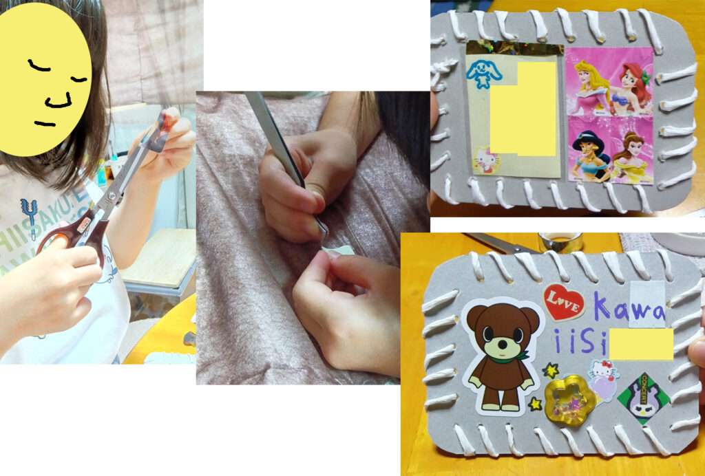 それから、厚紙に、紙紐をくるくる通して、枠を作ったのを、Aちゃんに渡しました。あれこれシールを見ながら選んで考えて、裏も表もシールを貼ってます。小さく切ったシールを剥がしたり、ハサミで切り取ったり、細かい仕事が丁寧なのでした。