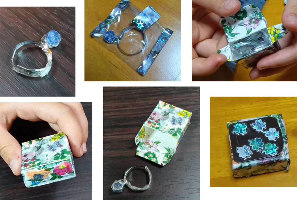 銀色のワイヤータイを丸めて、指輪を作っています。青いビーズにワイヤータイを通したんだねー。なるほど。これなら落ちないし、いい方法💗それから、持ってきた小さいガムの箱に、マスキングテープを貼ってきれいな箱にします。指輪も、ビニールの袋を作って入れて、大事に包装されて、出来上がりです。