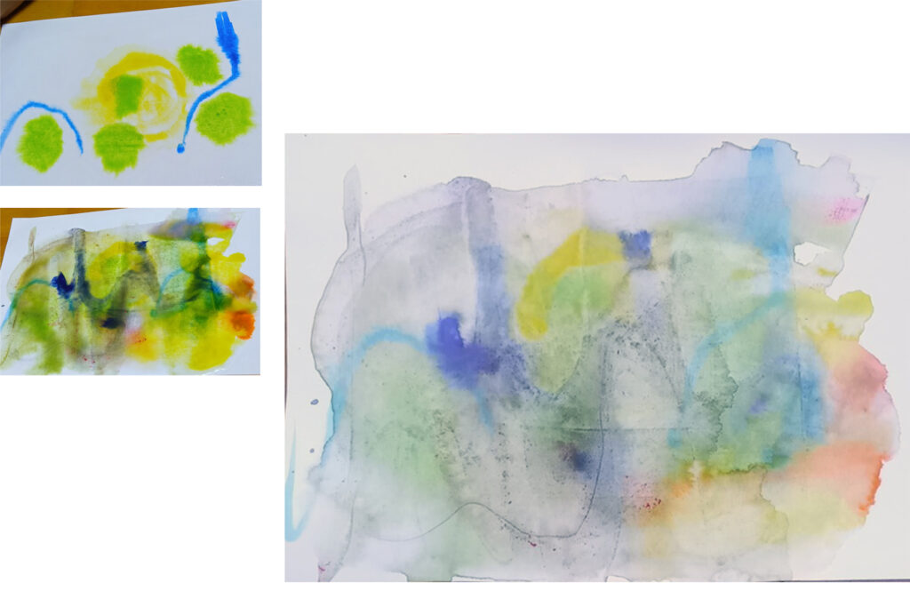 一緒に水彩を1枚描きました。色のにじみ具合を、あまり触らないで、きれいな混じり具合を、そのままにして完成にするAちゃんなのでした。