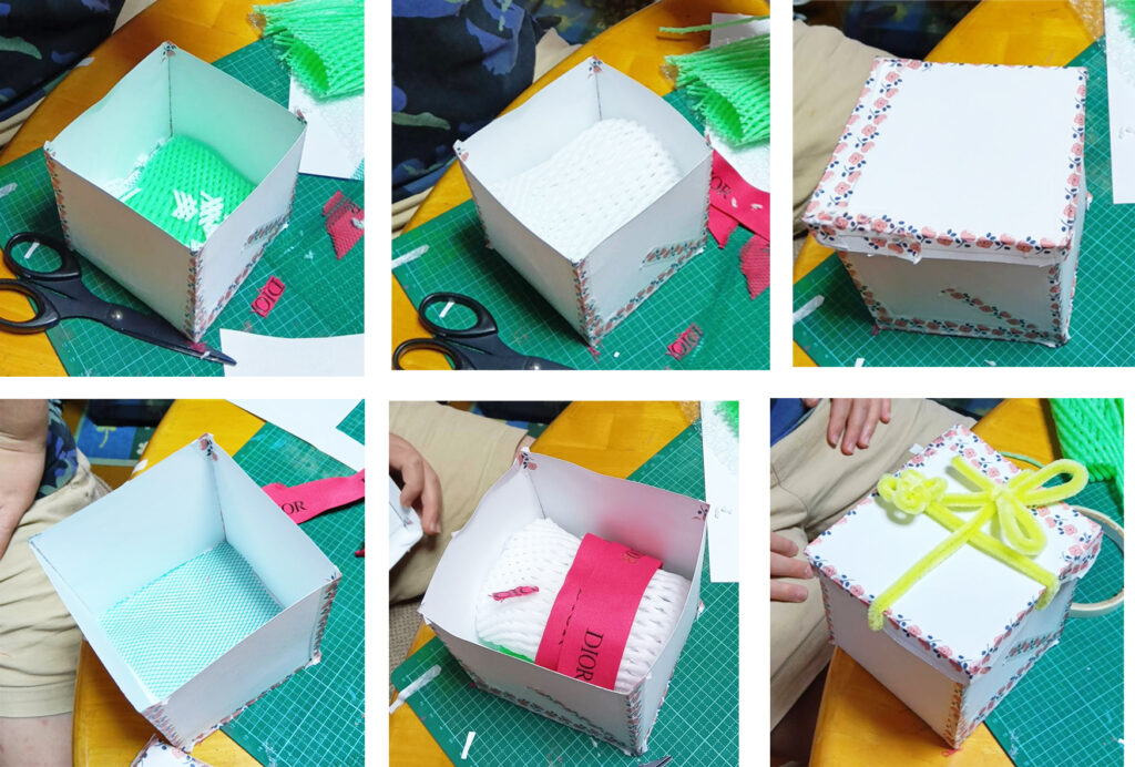 針金の自転車を入れる箱を、画用紙で作ります。画用紙は、針金に比べたらすごくやさしいので、余裕で楽しんで作るのです。工作用に、リボンと両面テープを持って来ていたので、さっそく使っています。きれいなマスキングテープも使います。箱が出来たら、リボンも考えたい💗黄色のモールをリボンにすることになりました。華やかな箱になりました。