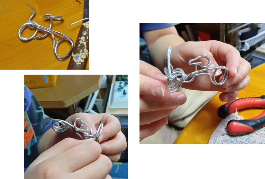 イルカは止めたけど、針金をそのまま使って、小さな自転車を作り始めました。アルミの少し太めの針金です。指先で曲げて形を作ります。8割くらい作った後で、ハンドルを1本付け足したいので、工夫が続きました。針金を切って、取り付けてみる、を繰り返してます。針金は、滑らかな形は作りやすいけど、付け足すときは、なかなか手強いのです。まずは、やってみるIちゃん💗、トライが続いているので、もう少しでなんとかなりそうな気配です。しばらくして針金は、上手いこと収まって、自転車は、完成しました。