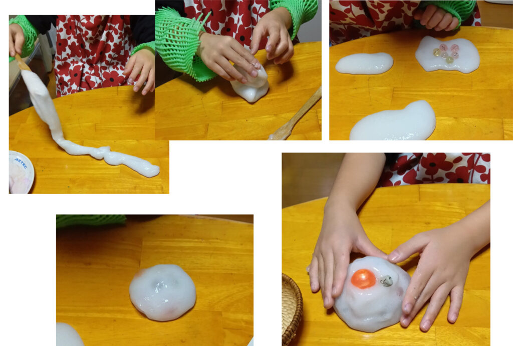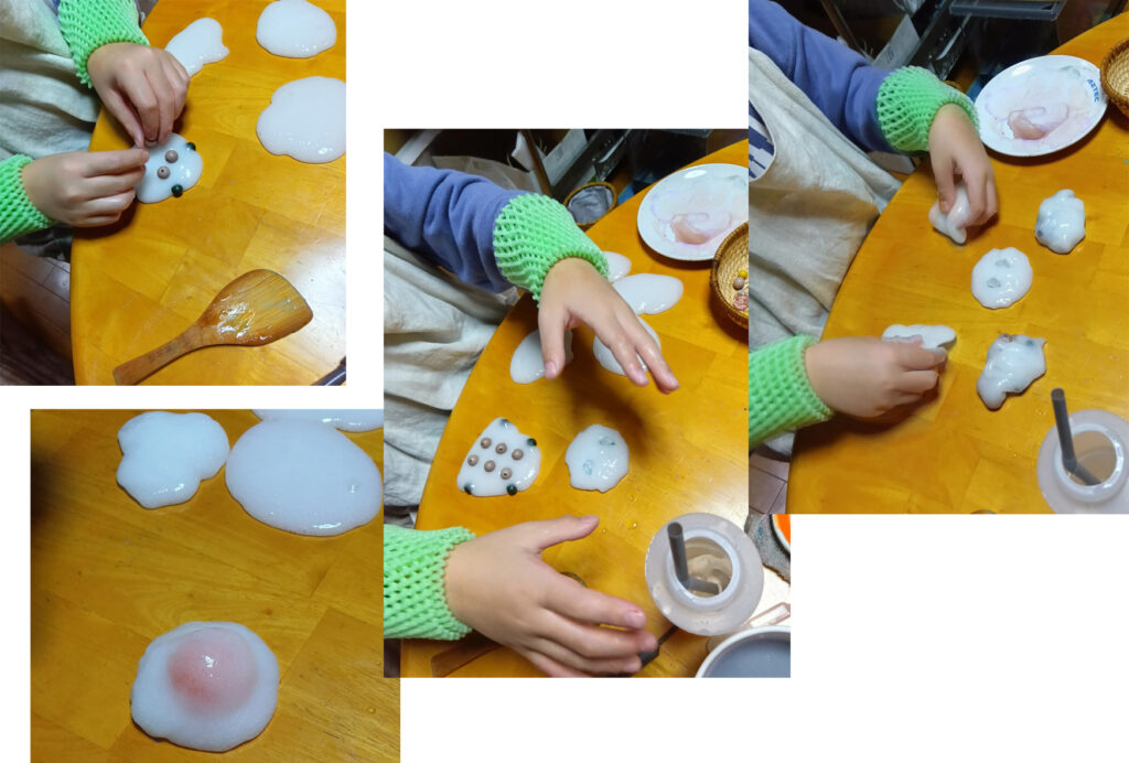 その後、スライムを作ります。トロトロしているのが、プルプルしてくるまで、練っていきます。ヘラが重くなってきたら、手でこねていきます。こねながら、「和菓子屋さんの店長ふたり」という、お話になっていきました。和菓子のトッピングにビーズはどうかな?と出してみました。黒いビーズは、スライムに乗せていくと豆大福みたいだし、透明なビーズの大福はそれも、すごく美味しそうなのでした。お母さんがお客さんになって買って、食べていくのです。作る人と、食べる人なのです。私もひとつ、いただきました。ごちそうさまでした。