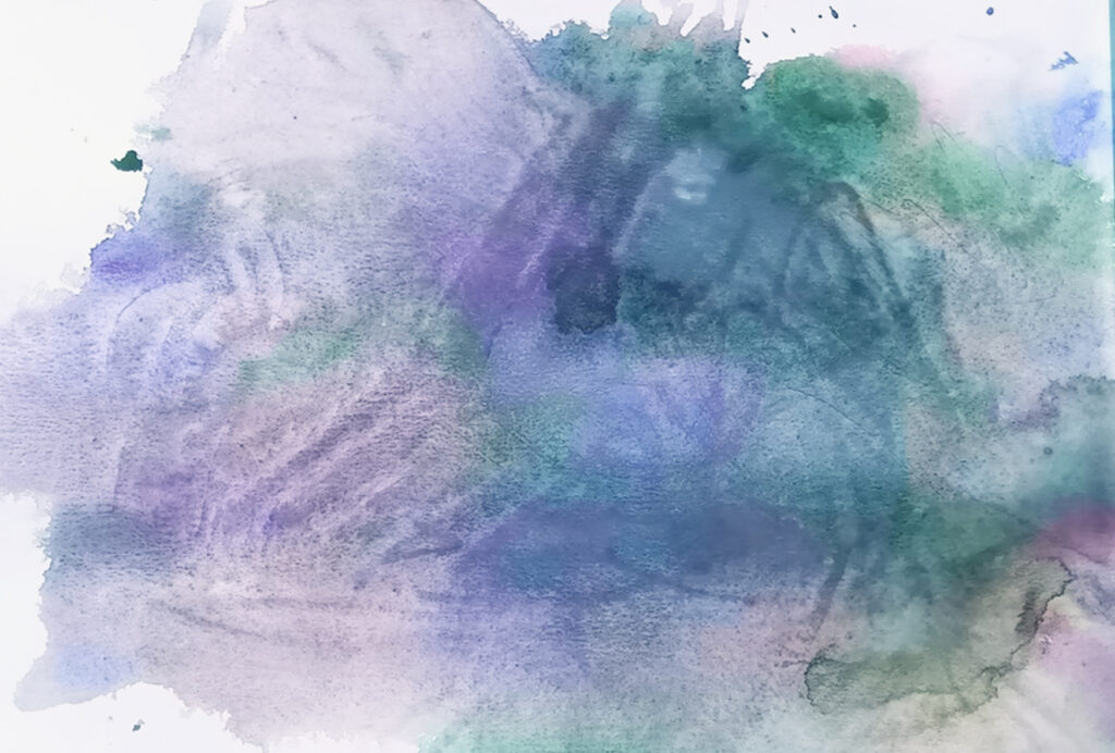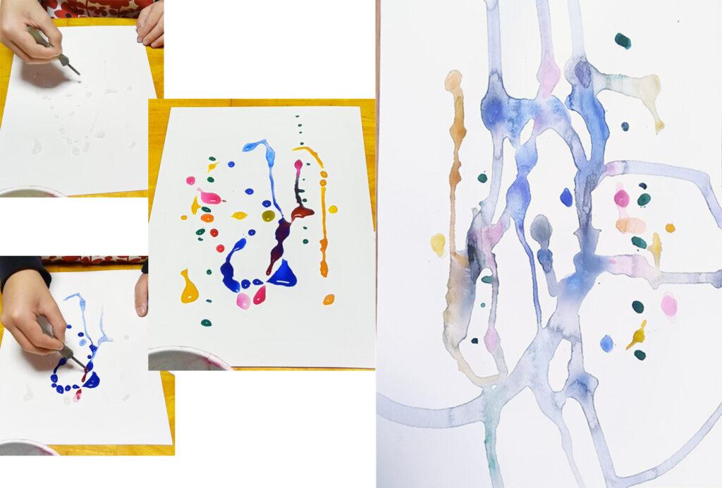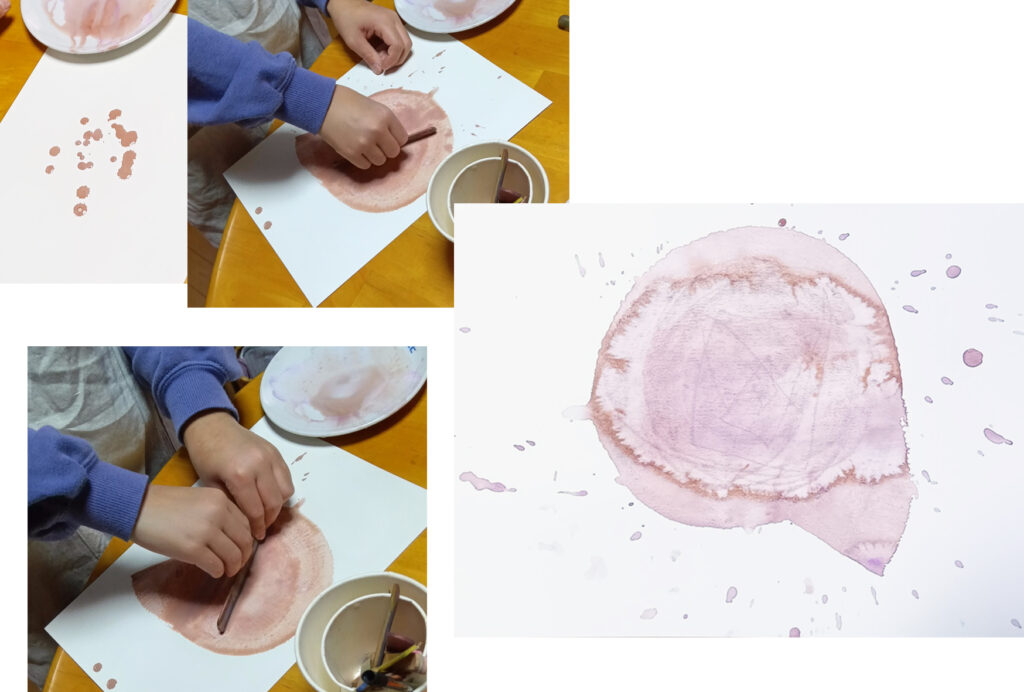 写真-4 Tくんの絵4枚目です。スポイトで色の水玉を作っていきます。本当は、そのまま乾かしたいんですが、時間がかかるので、水玉の水分を少し抜いて、乾かします。繊細な雰囲気の絵になりました。