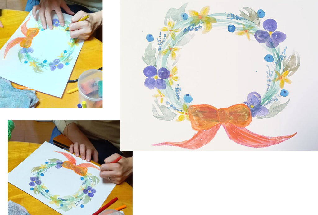 その後はそれぞれの絵を描きました。お母さんは、花のリースの絵を描いてます。描きながら、イマイチのようだったので、少し、コツをお伝えしたら、ぐっと味わいが出てきました。葉っぱや花やの筋を描いたり、色を抜いたり、足したりして、葉っぱらしさ、花らしさの要素が入っていくと、豊かな感じのリースになっていくのです。
