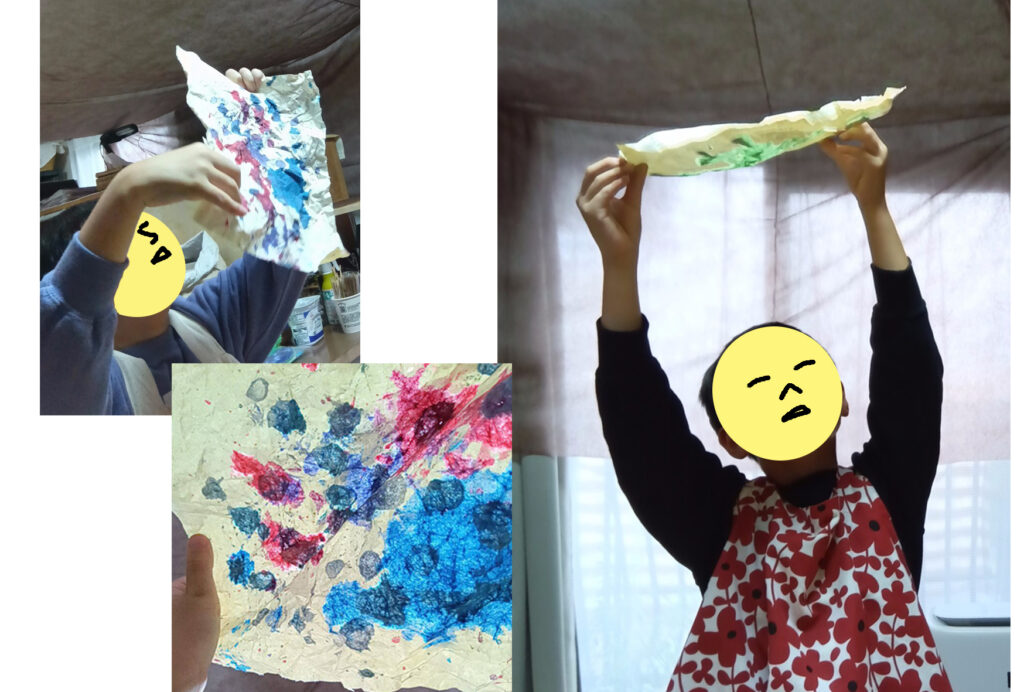 写真-8 くしゃくしゃの紙に水彩で遊びます。透かしてみたら、きれいなのでした。今度は、もっといろんな色で遊んだら、ステンドグラスみたいになるかも。